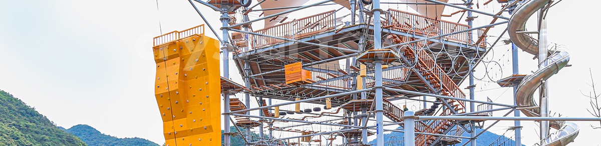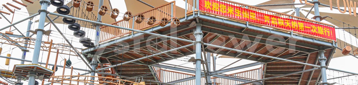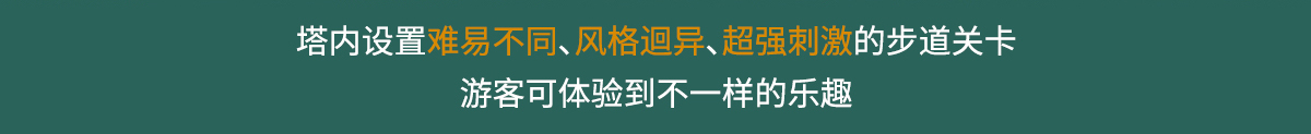 單層高達 4.3m,總高達 19.8m,內(nèi)部以晶體結構搭建架空層 1-4 個步道層級,打造超過 680m 長的空中游樂路線,開模制作,國內(nèi)獨一無二,雙重保護更安全,利用防呆裝置做到安全萬無一失。其中包含 87 個運動項目(包含尖叫滑梯、巨形秋千、低空蹦極),能滿足 150 個游客同時進行冒險體驗,被譽為 " 運動游樂之王 "。