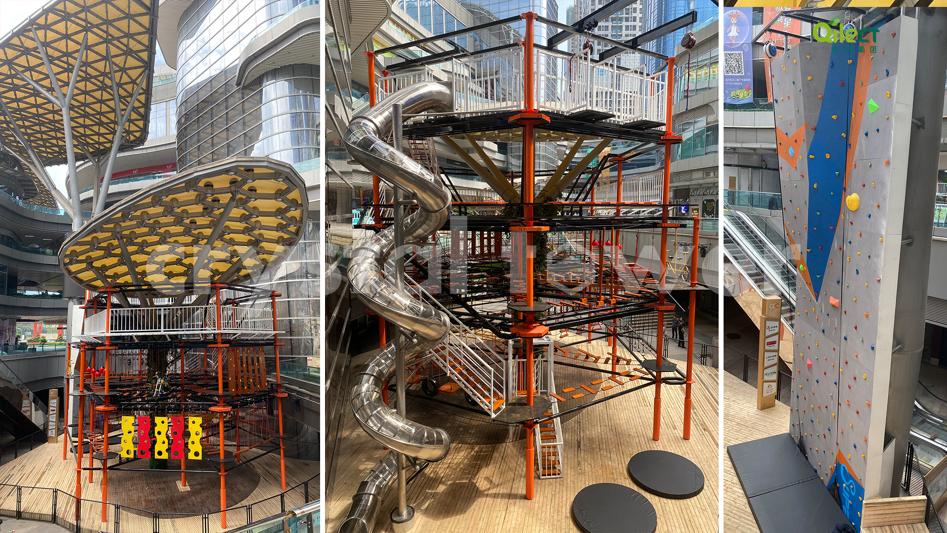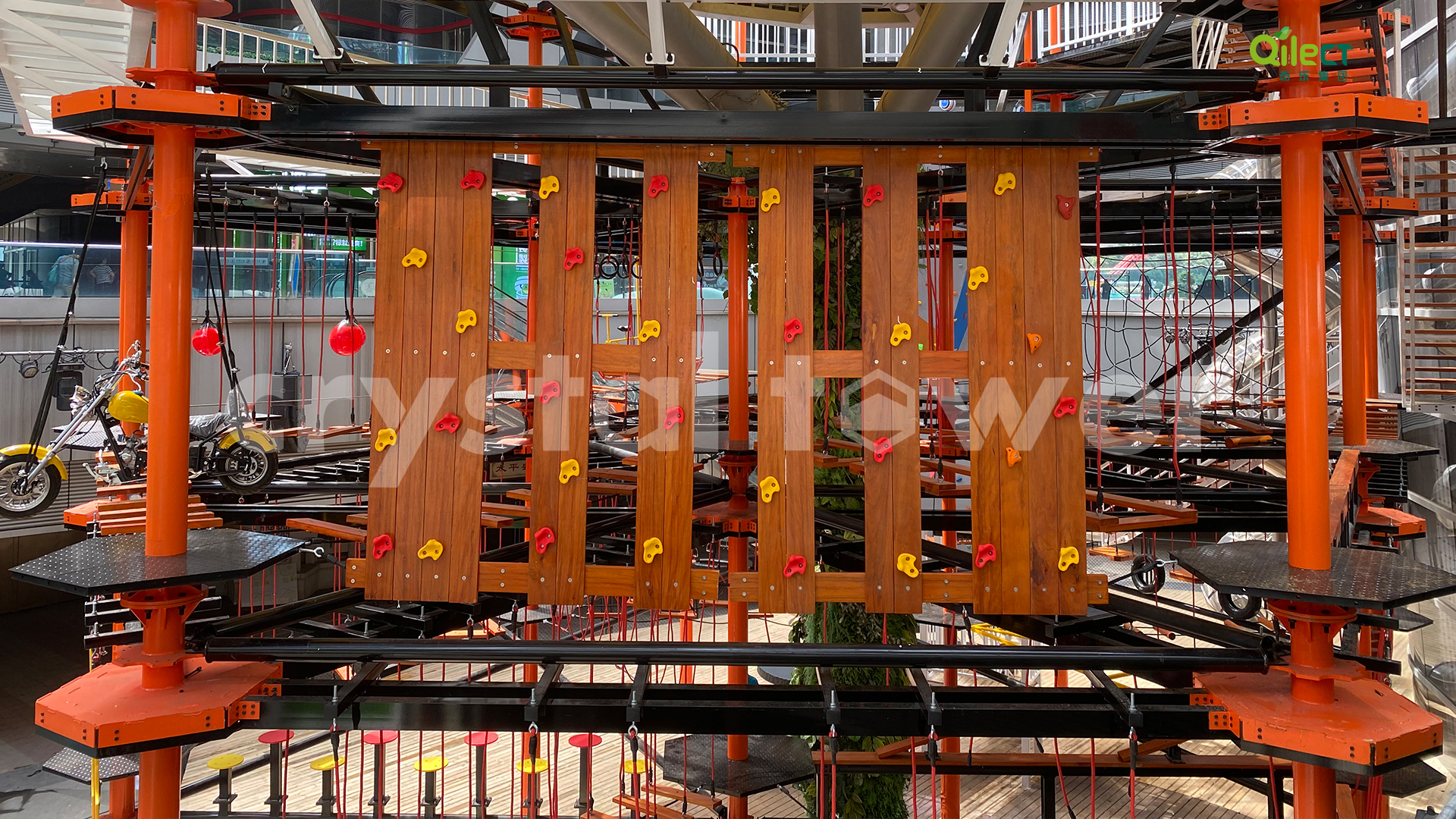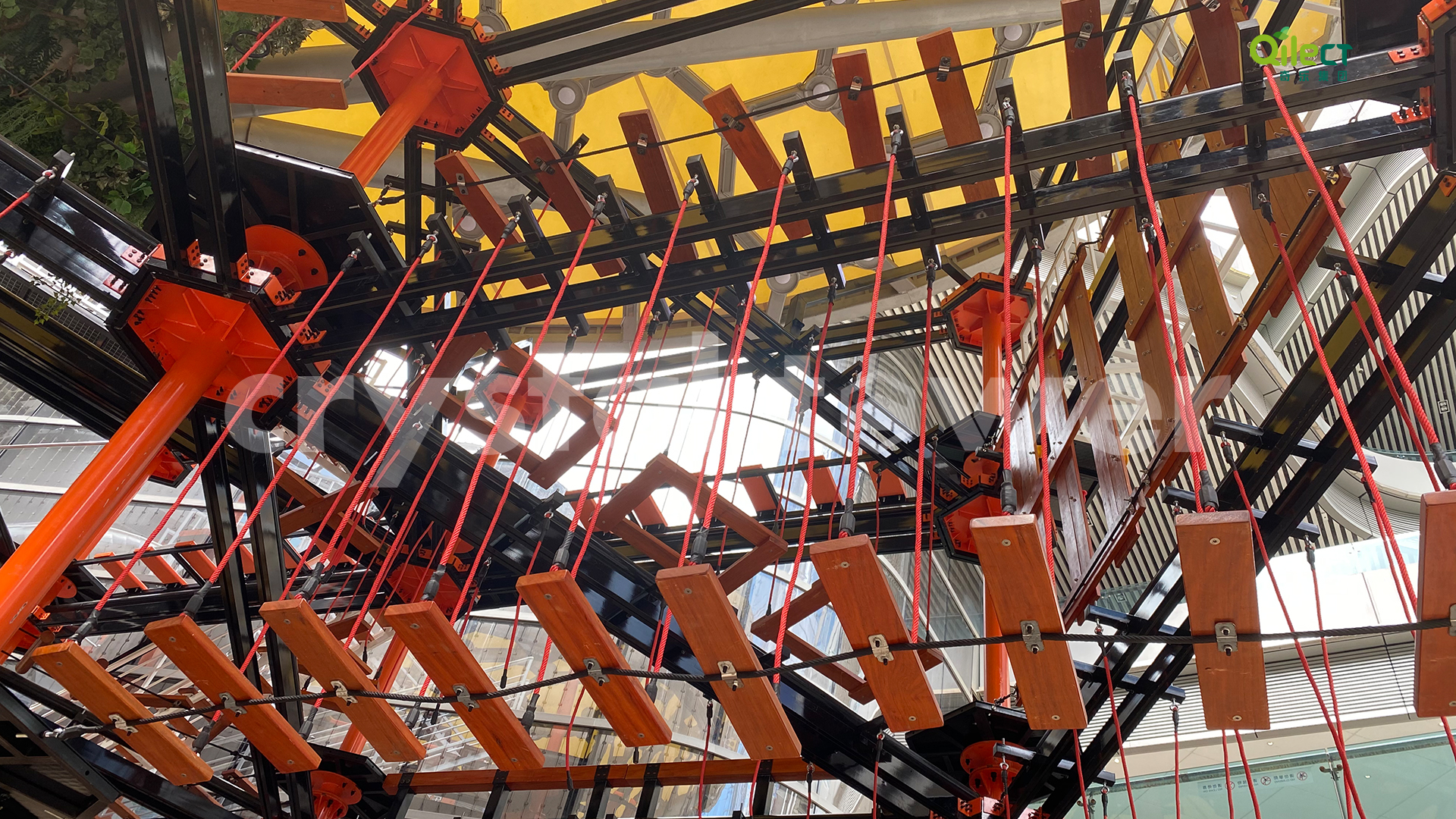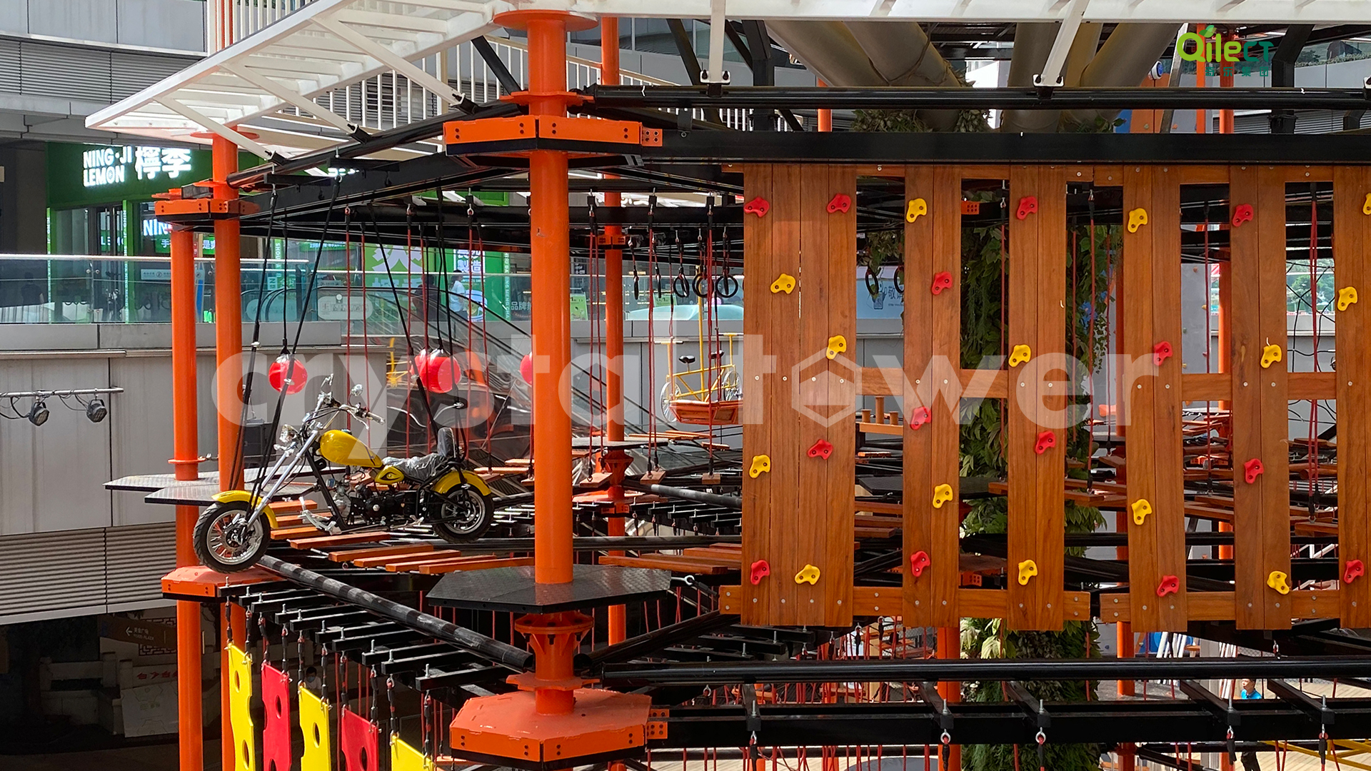 設備占地面積達到 180m2,綜合用地面積達 240m2,單層高達 3m,總高達 14m,內(nèi)部以晶體結(jié)構(gòu)搭建架空層 1-3 個步道層級,打造超過380m 長的空中游樂路線,其中包含 66 個運動項目(包含尖叫滑梯、低空蹦極、溜索),能滿足 70 個游客同時進行冒險體驗。