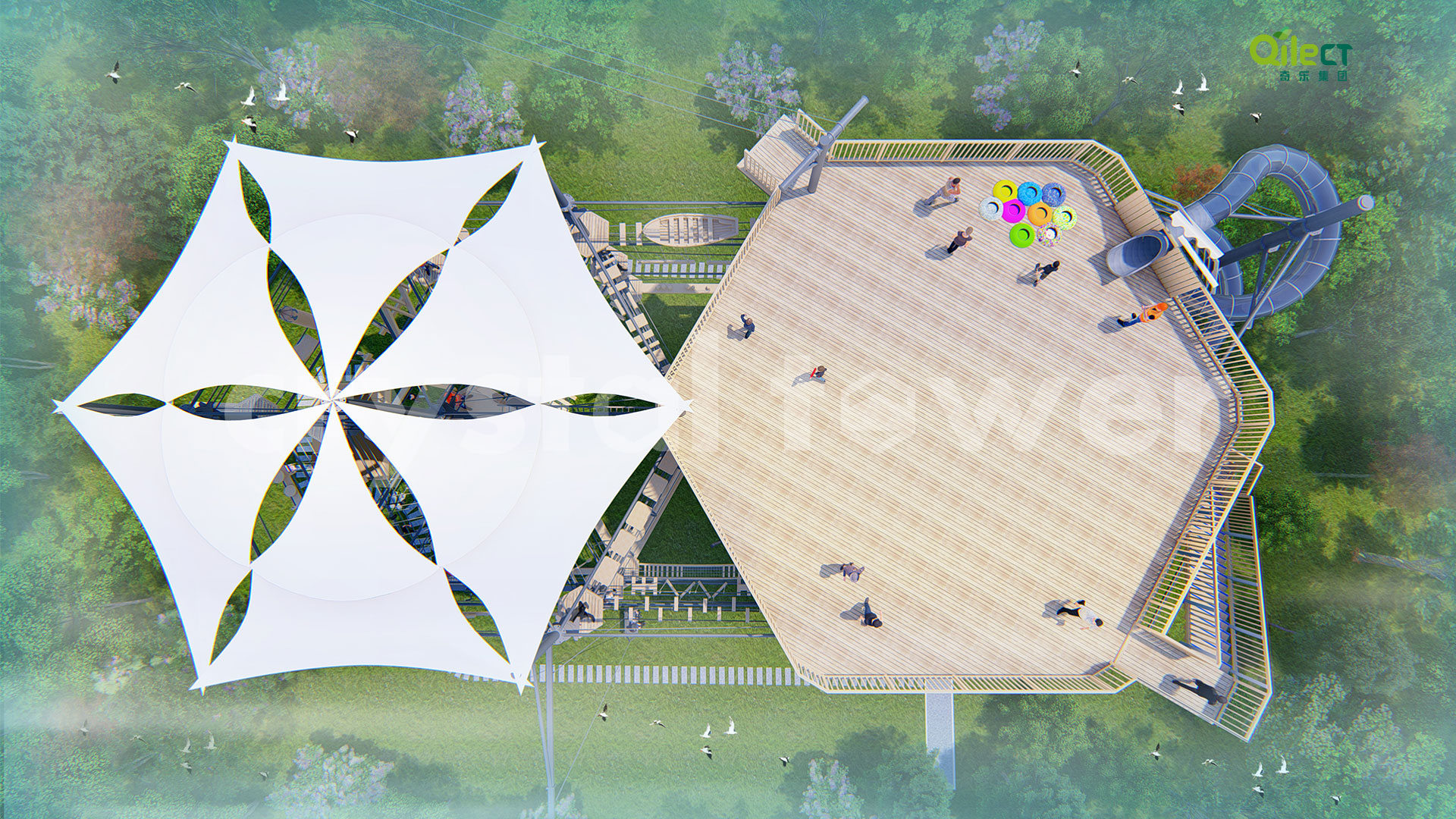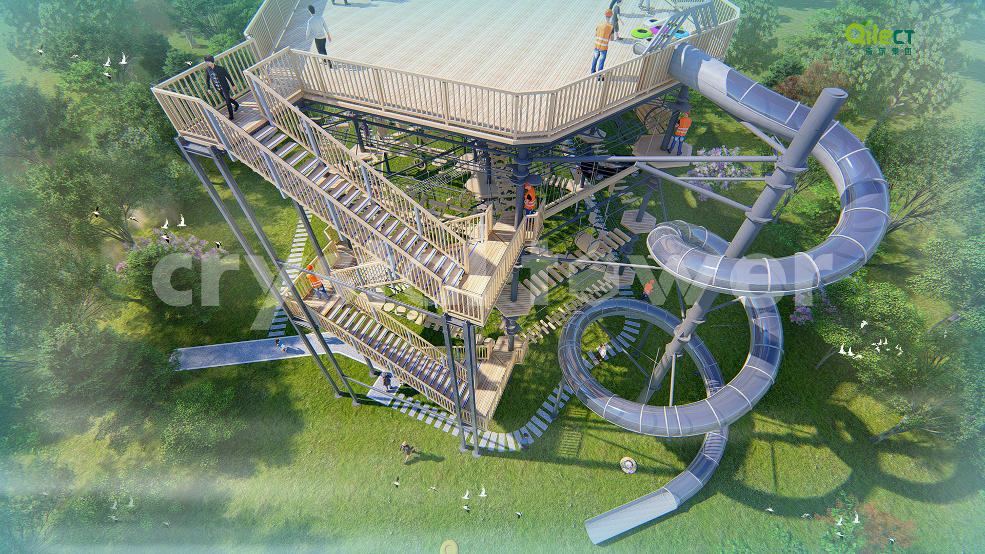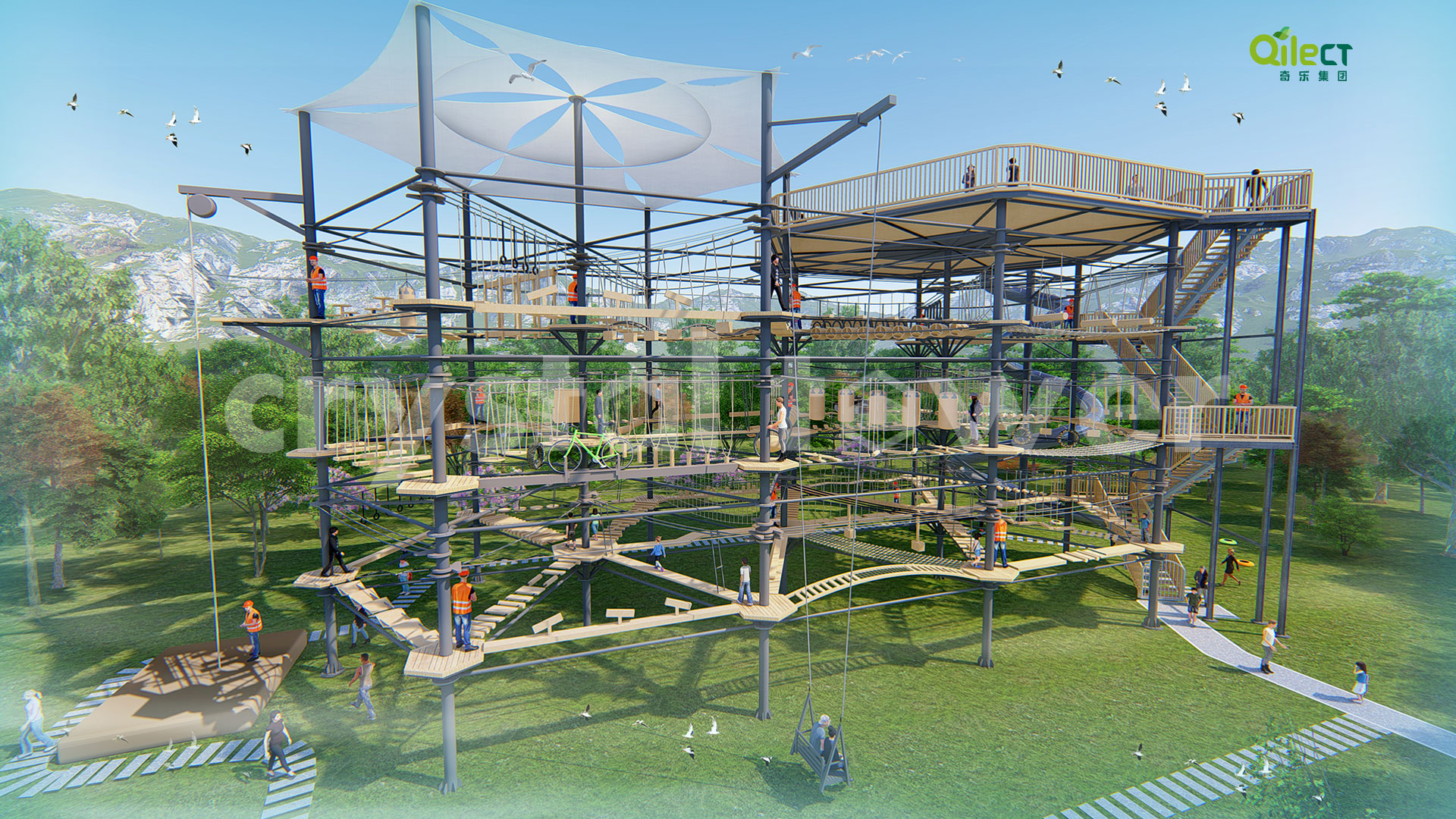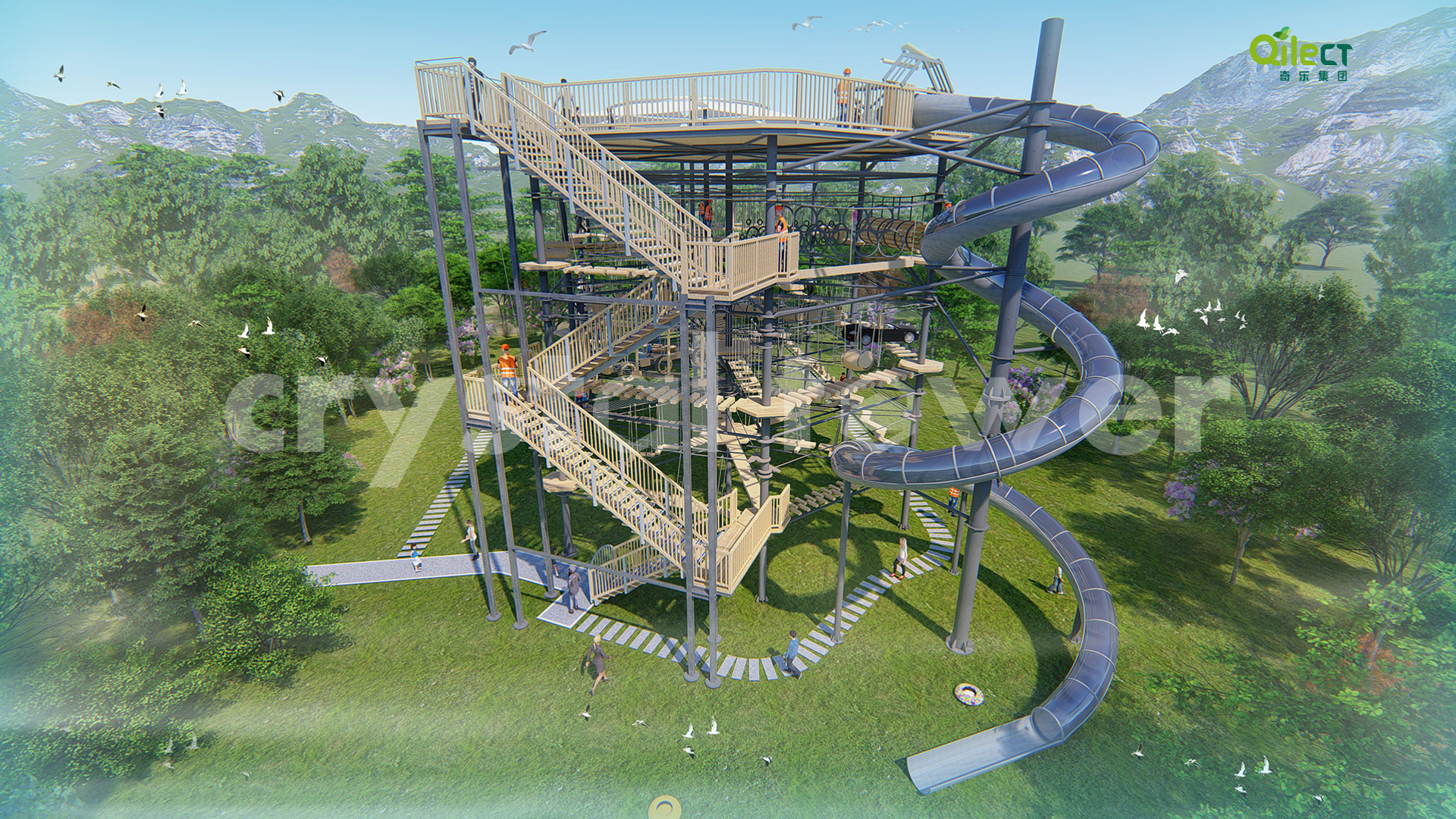 本項(xiàng)目建于戶外自然景區(qū)(亦可在室內(nèi)搭建),配置上百種運(yùn)動健身、探險(xiǎn)互動項(xiàng)目,項(xiàng)目游樂步道設(shè)有不同難度系數(shù)的項(xiàng)目供游客體驗(yàn),是景區(qū)中一個創(chuàng)新性、地標(biāo)性的立體娛樂綜合體。該設(shè)備占地面積達(dá)到800㎡,綜合用地面積達(dá)1000㎡,單層高達(dá)4m,內(nèi)部以晶體結(jié)構(gòu)搭建架空層1-4個步道層級,打造層超過1m長的空中游樂路線。