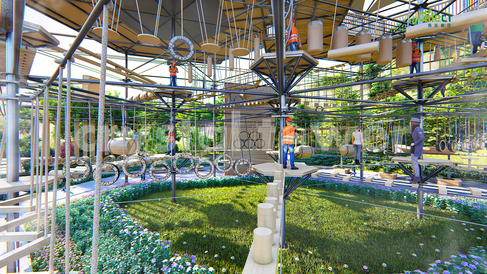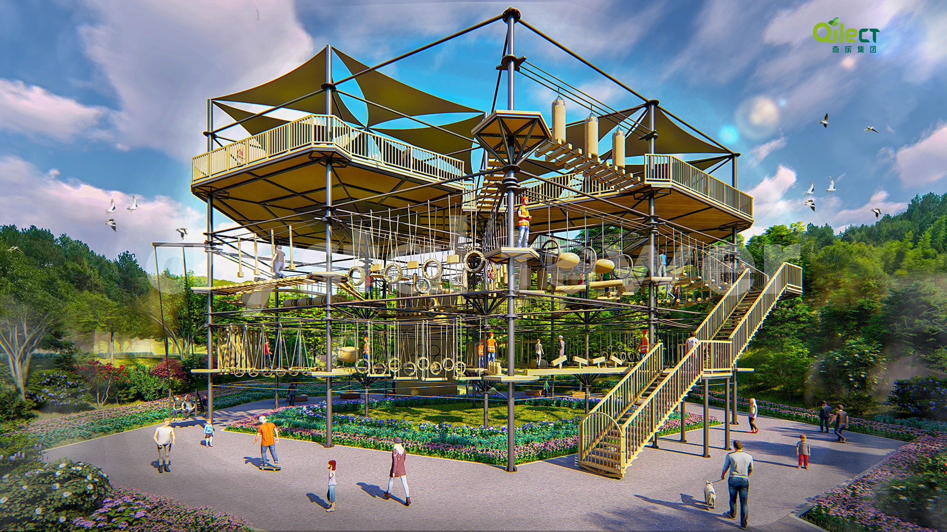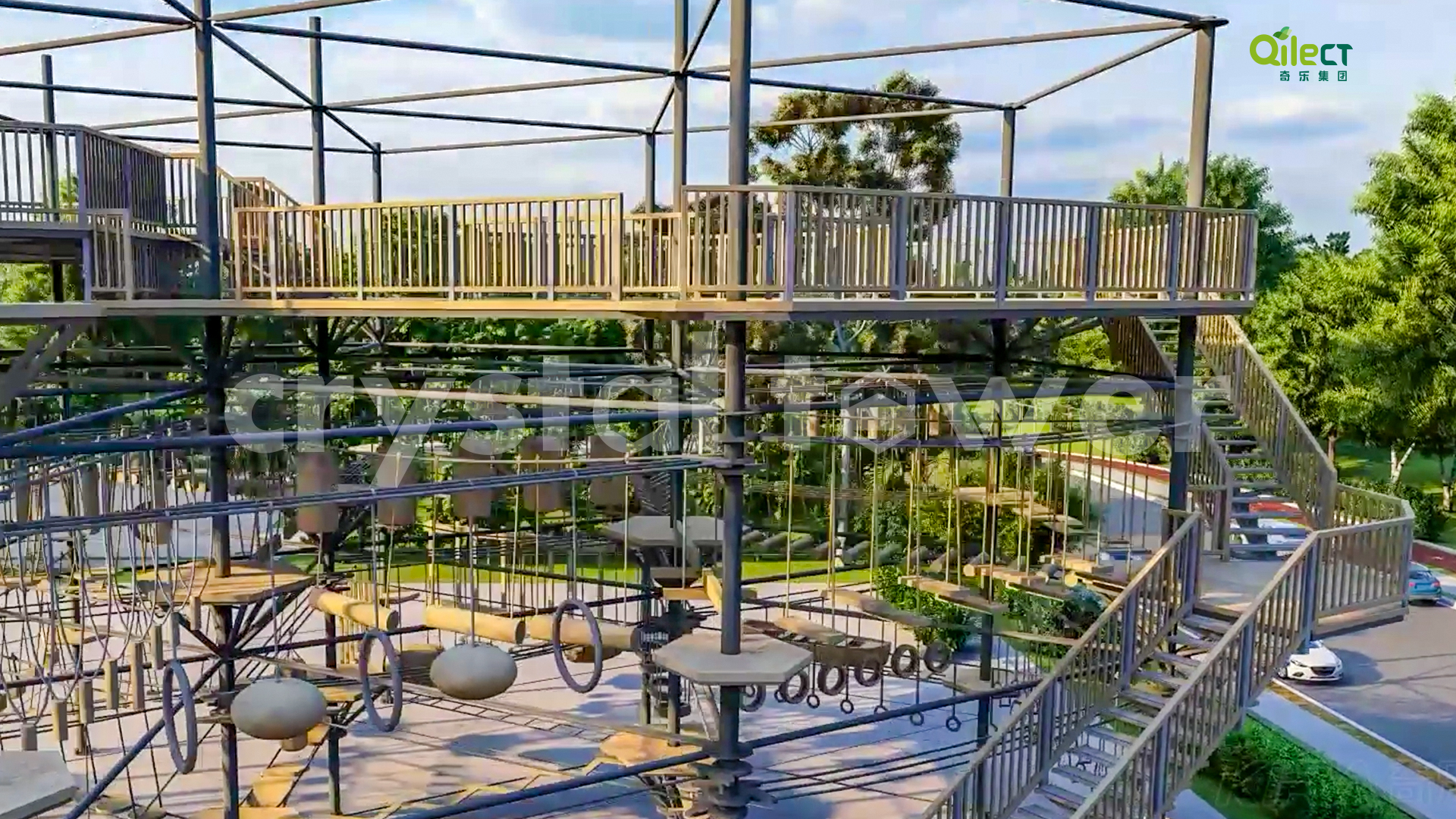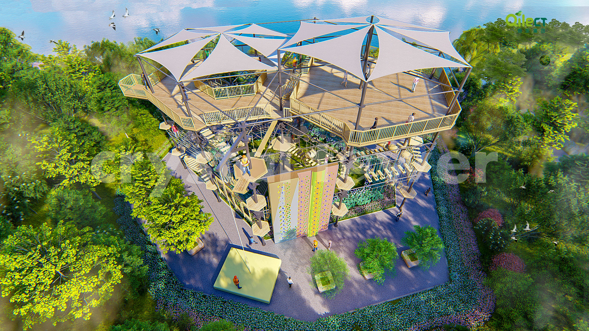 本項(xiàng)目建于戶外自然景區(qū)(亦可在室內(nèi)搭建),配置上百種運(yùn)動健身、探險互動項(xiàng)目,項(xiàng)目游樂步道設(shè)有不同難度系數(shù)的項(xiàng)目供游客體驗(yàn),是景區(qū)中一個創(chuàng)新性、地標(biāo)性的立體娛樂綜合體。該設(shè)備占地面積達(dá)到500m2,綜合用地面積達(dá)600m2,單層高達(dá)4m,內(nèi)部以晶體結(jié)構(gòu)搭建架空層1-4個步道層級,打造層超過600m長的空中游樂路線。