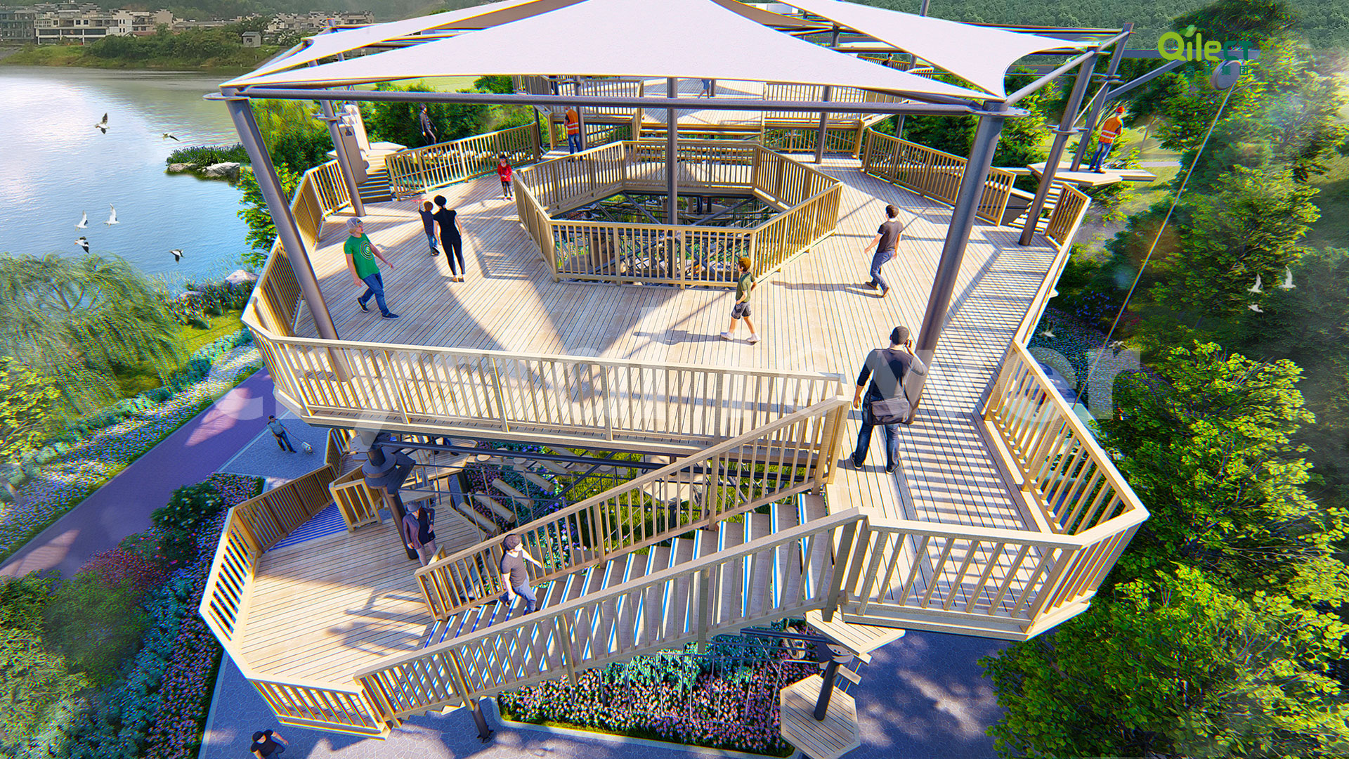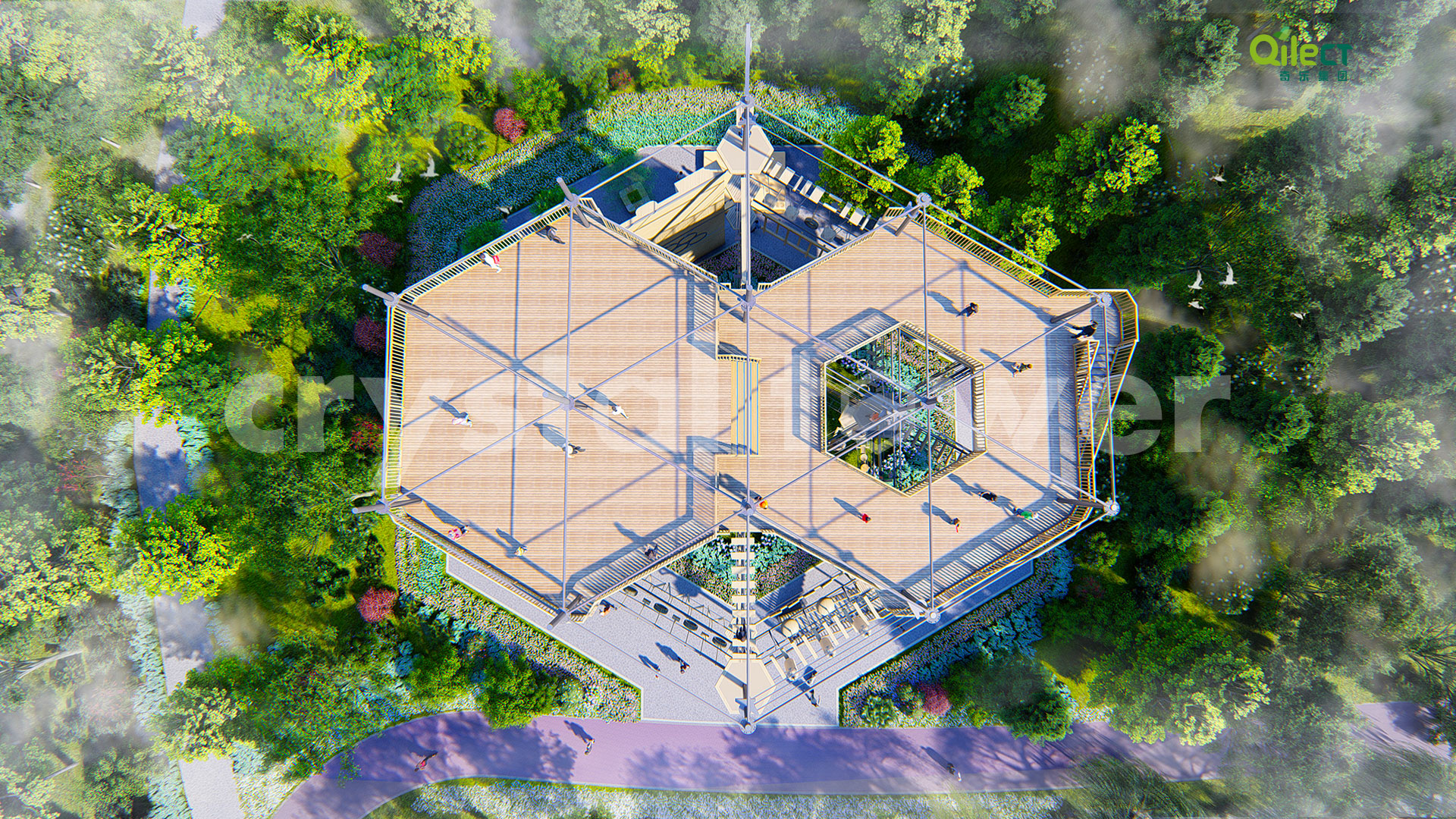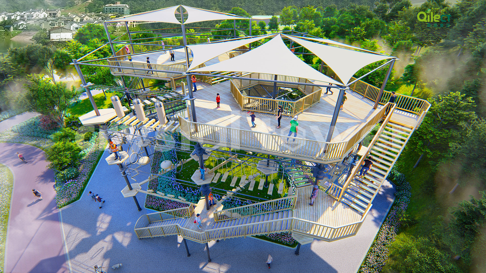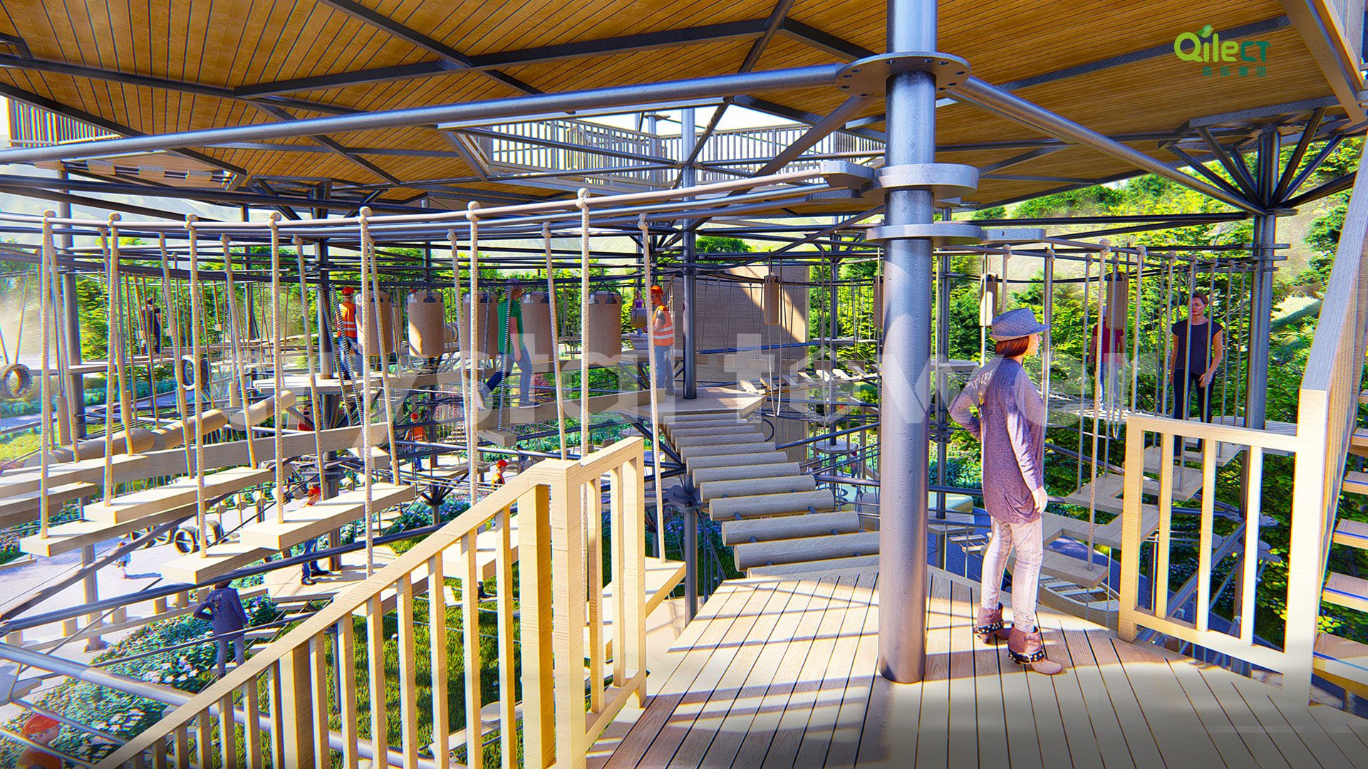 本項(xiàng)目建于戶外自然景區(qū)(亦可在室內(nèi)搭建),配置上百種運(yùn)動健身、探險互動項(xiàng)目,項(xiàng)目游樂步道設(shè)有不同難度系數(shù)的項(xiàng)目供游客體驗(yàn),是景區(qū)中一個創(chuàng)新性、地標(biāo)性的立體娛樂綜合體。該設(shè)備占地面積達(dá)到500m2,綜合用地面積達(dá)600m2,單層高達(dá)4m,內(nèi)部以晶體結(jié)構(gòu)搭建架空層1-4個步道層級,打造層超過600m長的空中游樂路線。