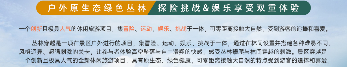 滿足各年齡段、團(tuán)體及個人游客進(jìn)行挑戰(zhàn)、團(tuán)建、競賽等叢林穿越探險娛樂