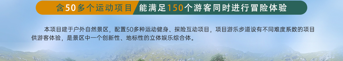 本項(xiàng)目建于戶外自然景區(qū),配置50多種運(yùn)動(dòng)健身、探險(xiǎn)互動(dòng)項(xiàng)目,項(xiàng)目游樂步道設(shè)有不同難度系數(shù)的項(xiàng)目供游客體驗(yàn),是景區(qū)中一個(gè)創(chuàng)新性、地標(biāo)性的立體娛樂綜合體。
