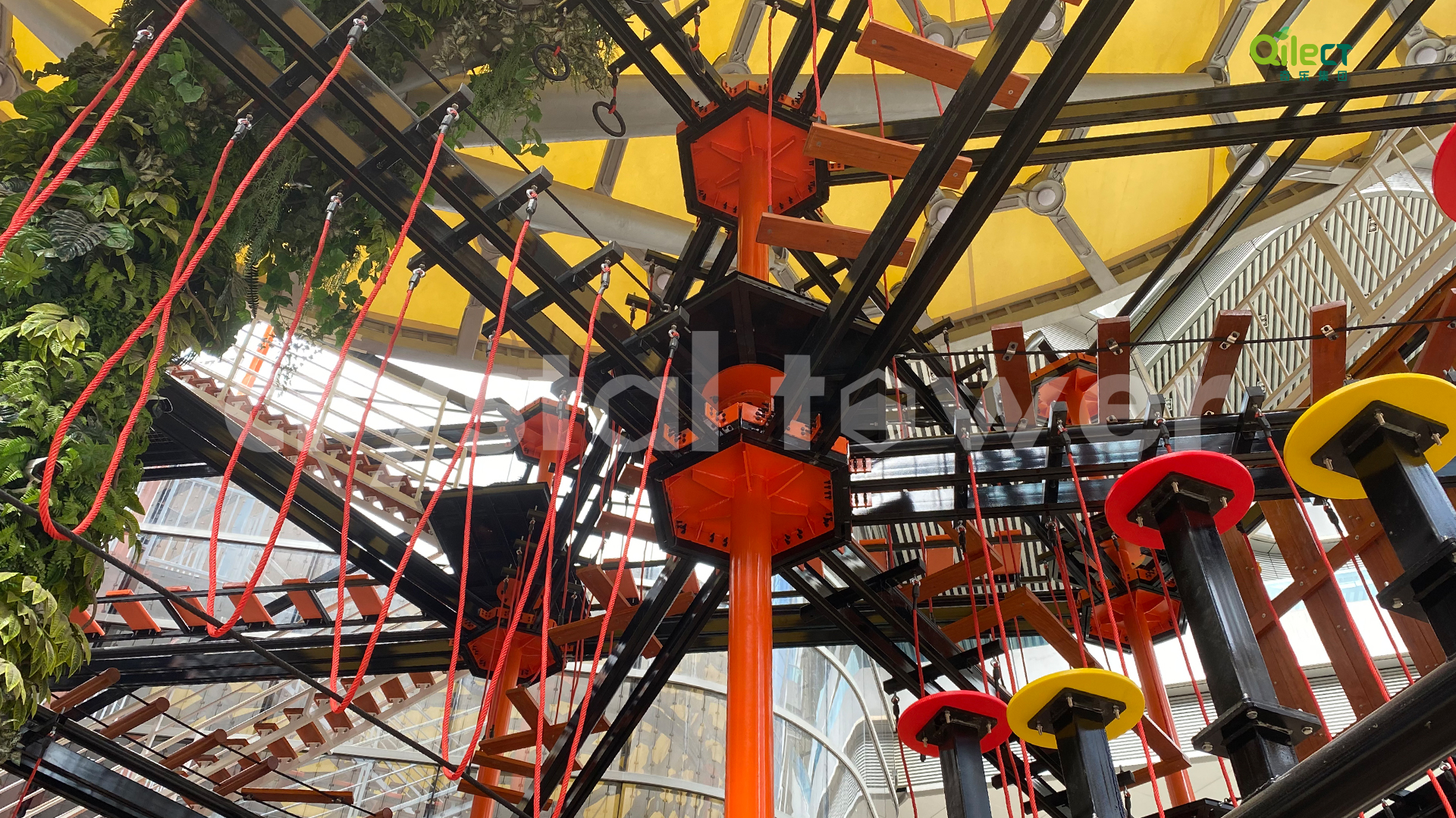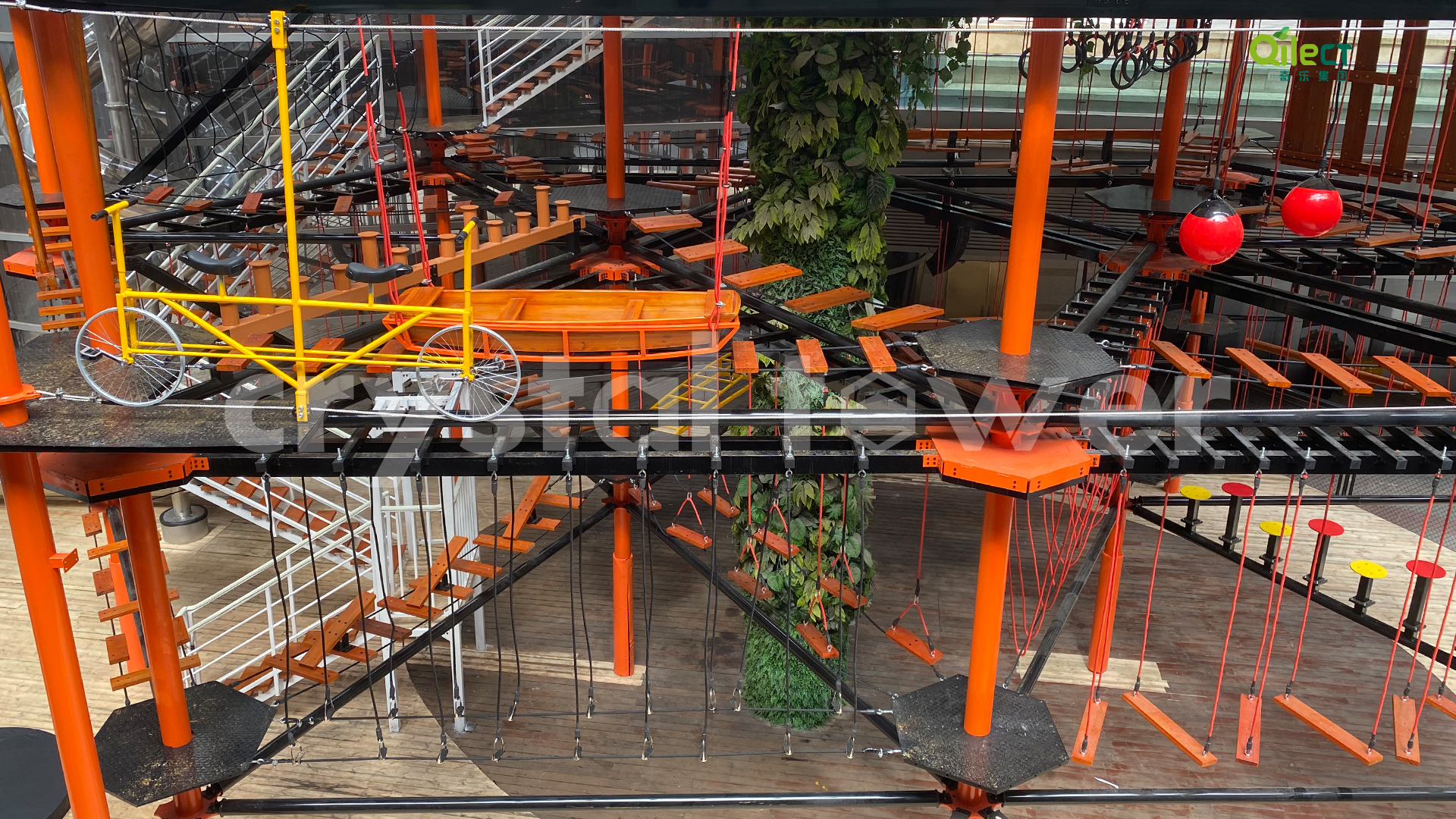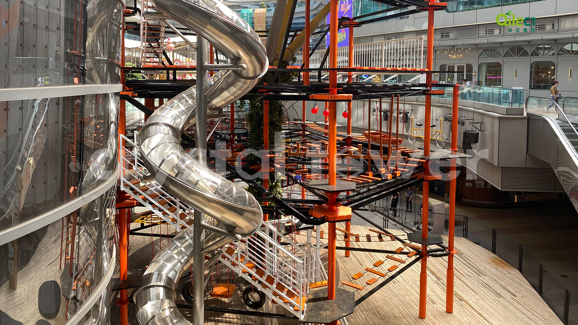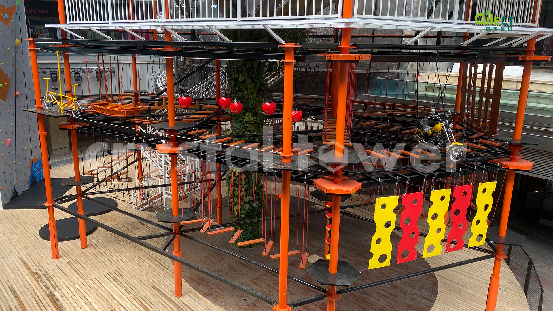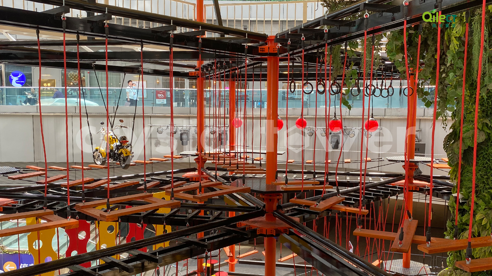 設備占地面積達到 180m2,綜合用地面積達 240m2,單層高達 3m,總高達 14m,內(nèi)部以晶體結(jié)構(gòu)搭建架空層 1-3 個步道層級,打造超過380m 長的空中游樂路線,其中包含 66 個運動項目(包含尖叫滑梯、低空蹦極、溜索),能滿足 70 個游客同時進行冒險體驗。