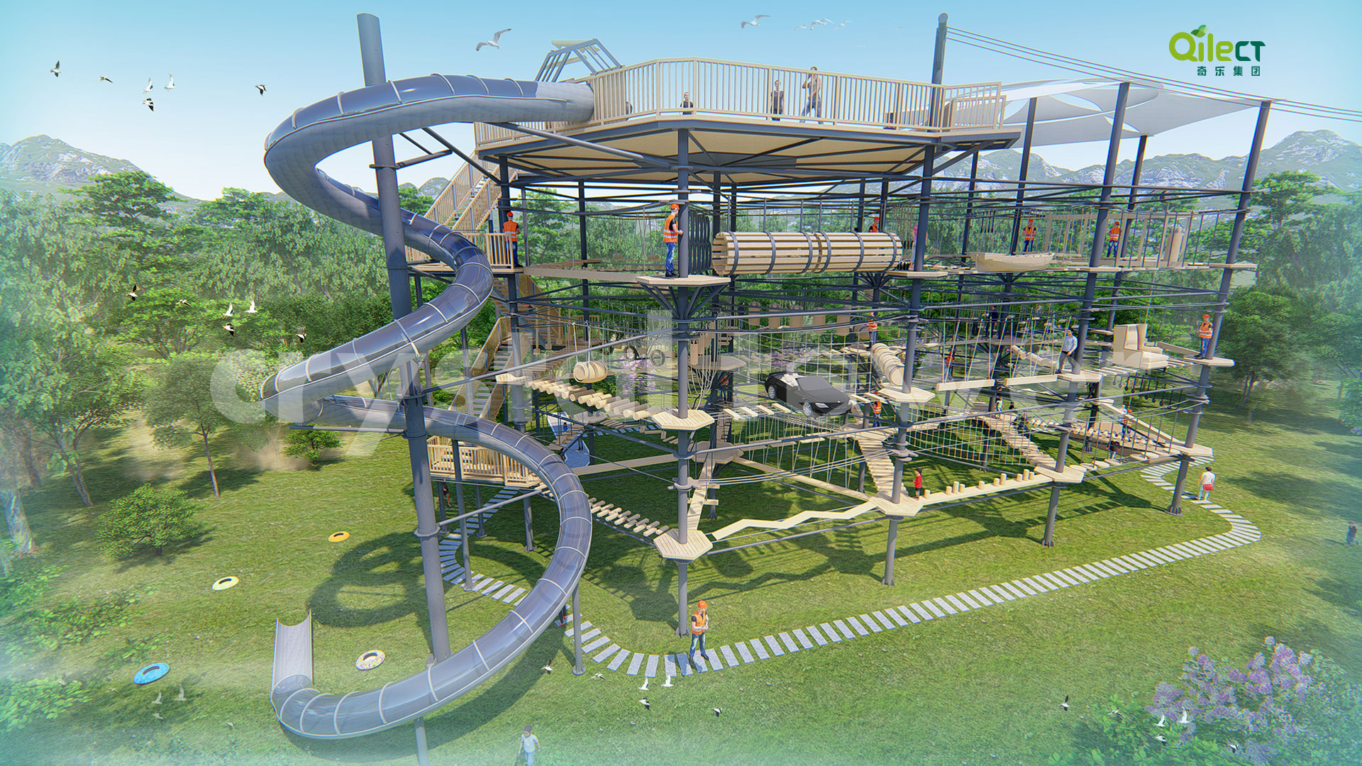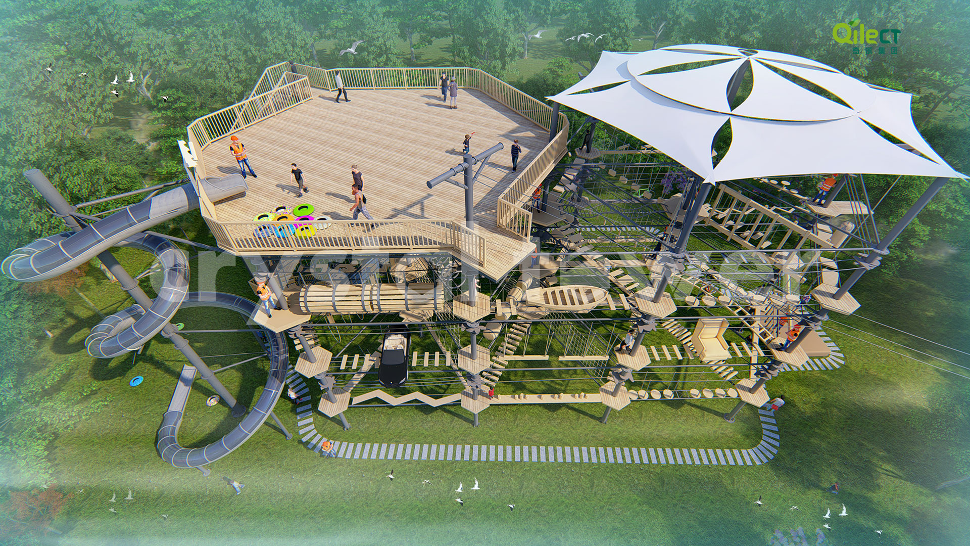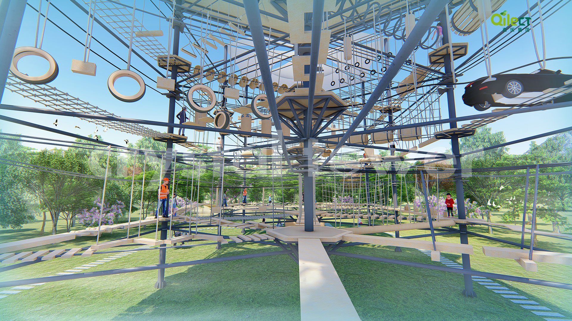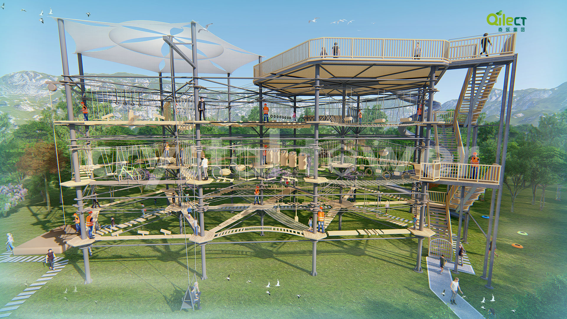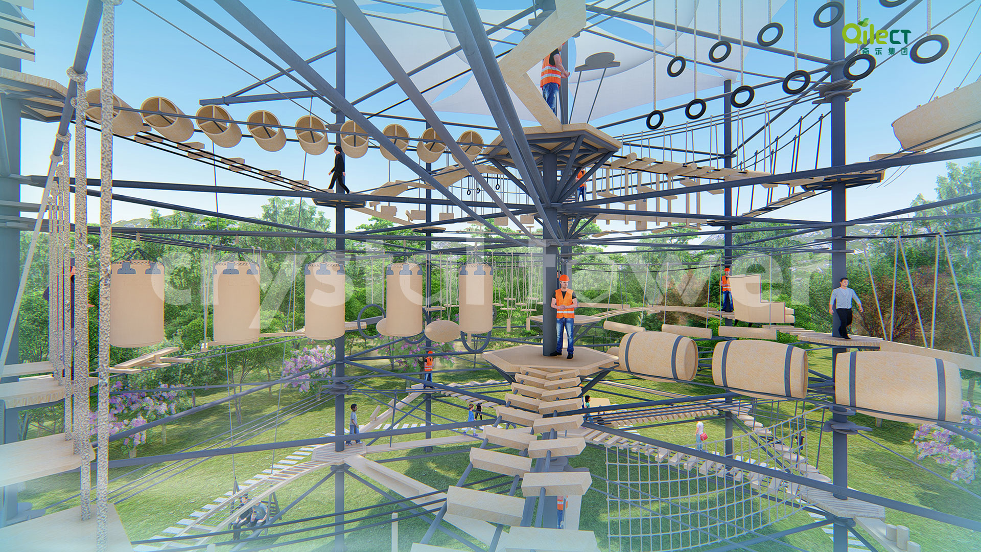 本項(xiàng)目建于戶外自然景區(qū)(亦可在室內(nèi)搭建),配置上百種運(yùn)動健身、探險(xiǎn)互動項(xiàng)目,項(xiàng)目游樂步道設(shè)有不同難度系數(shù)的項(xiàng)目供游客體驗(yàn),是景區(qū)中一個創(chuàng)新性、地標(biāo)性的立體娛樂綜合體。該設(shè)備占地面積達(dá)到800㎡,綜合用地面積達(dá)1000㎡,單層高達(dá)4m,內(nèi)部以晶體結(jié)構(gòu)搭建架空層1-4個步道層級,打造層超過1m長的空中游樂路線。