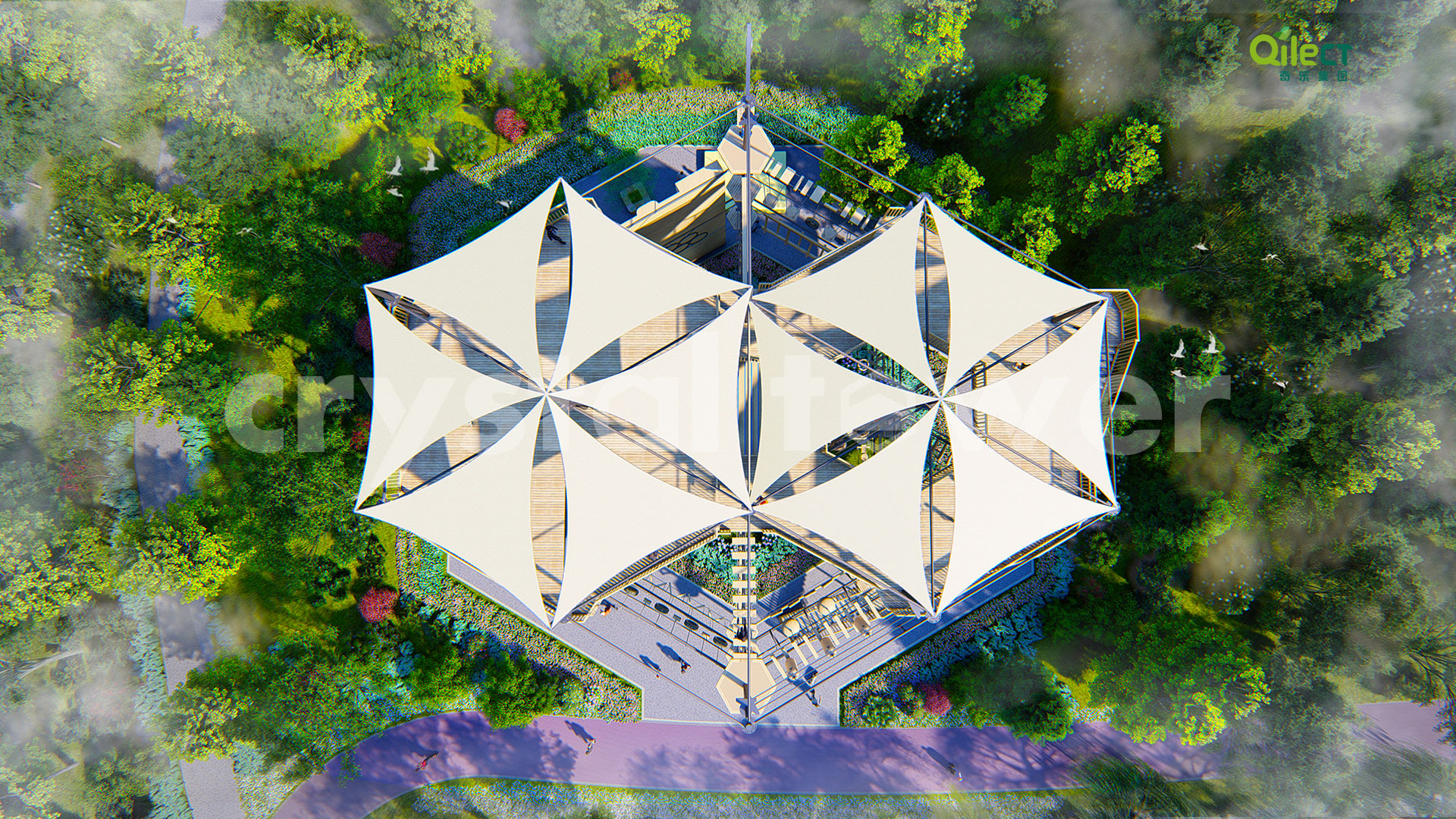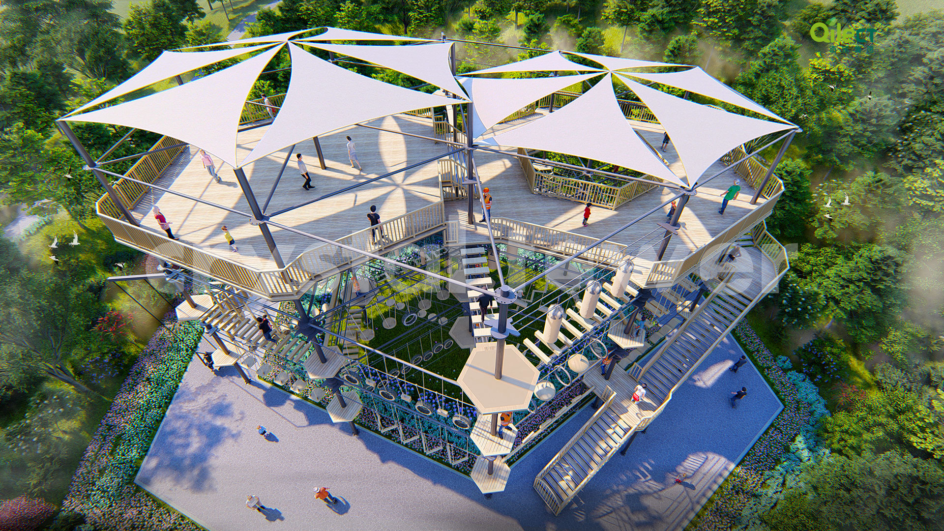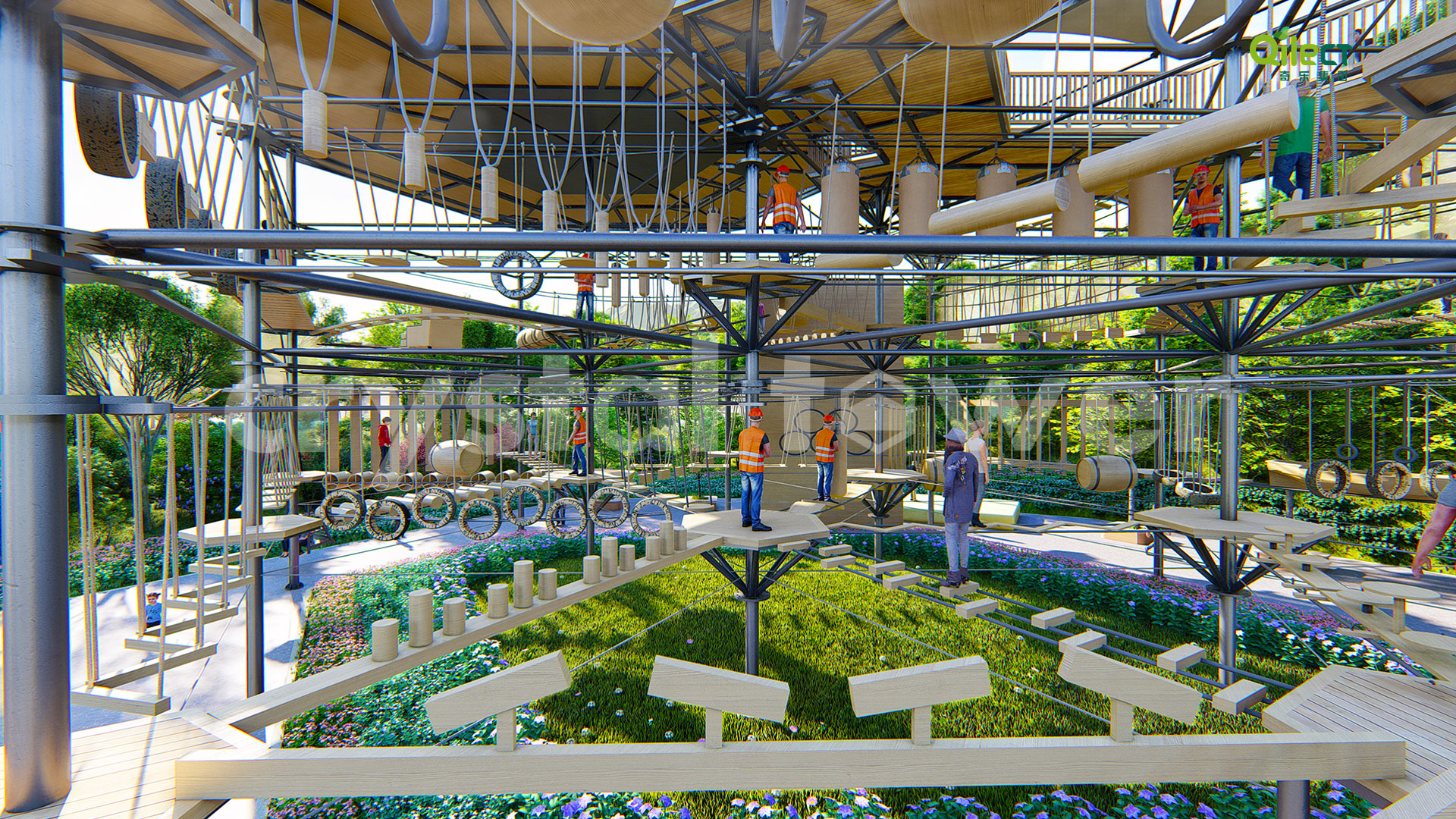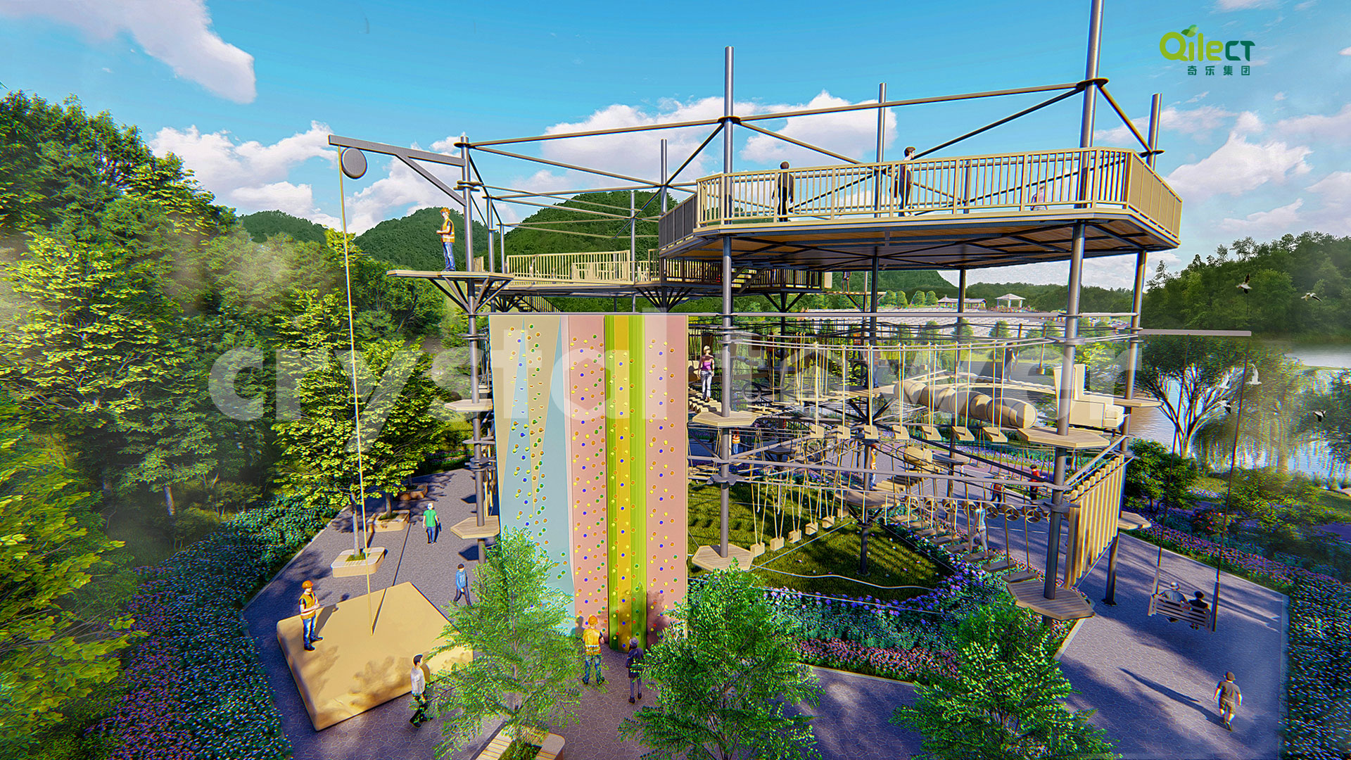 本項(xiàng)目建于戶外自然景區(qū)(亦可在室內(nèi)搭建),配置上百種運(yùn)動健身、探險互動項(xiàng)目,項(xiàng)目游樂步道設(shè)有不同難度系數(shù)的項(xiàng)目供游客體驗(yàn),是景區(qū)中一個創(chuàng)新性、地標(biāo)性的立體娛樂綜合體。該設(shè)備占地面積達(dá)到500m2,綜合用地面積達(dá)600m2,單層高達(dá)4m,內(nèi)部以晶體結(jié)構(gòu)搭建架空層1-4個步道層級,打造層超過600m長的空中游樂路線。